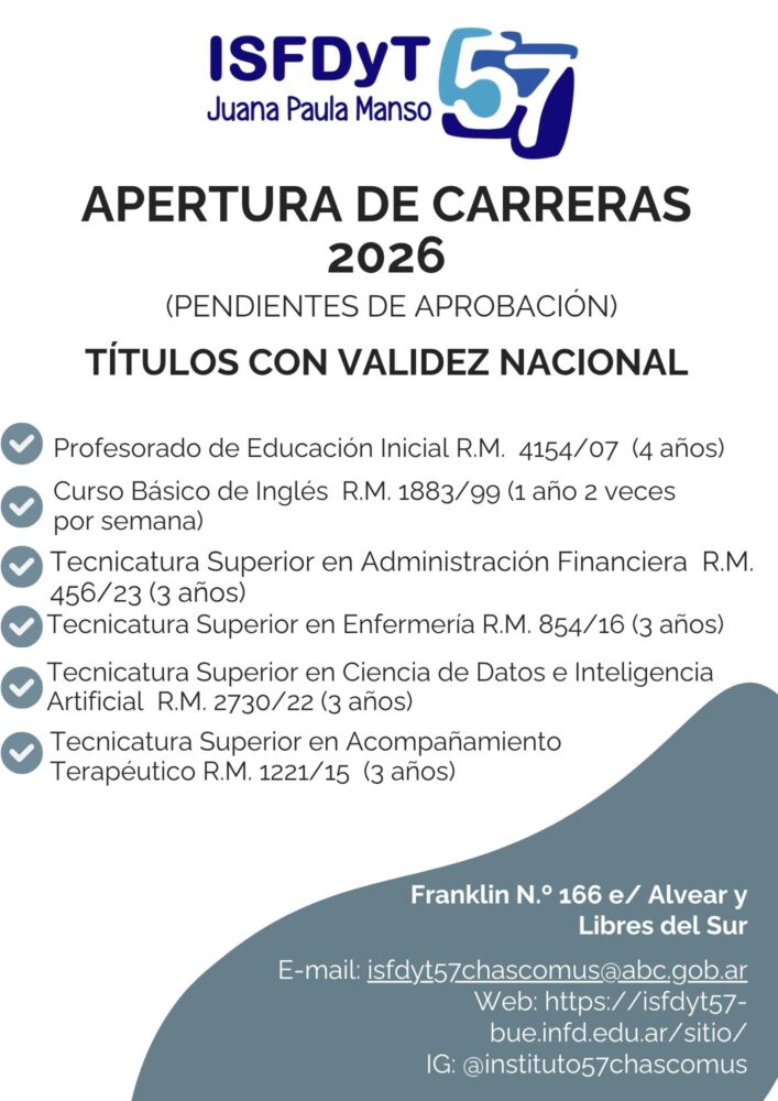 El Instituto Superior de Formación Docente y Técnica N° 57 de Chascomús, es una institución perteneciente a la Región XVII, dependiente del Sistema Educativo, gestionada por el Estado de la Provincia de Buenos Aires. A través de este sitio en Internet, nuestro Instituto comunicará novedades, acercará información, compartirá experiencias y brindará apoyo y asesoramiento a alumnos, docentes e interesados en formar parte de esta comunidad educativa. Junto con varios cientos de Institutos, integramos la Red Virtual de Institutos Superiores de Formación Docente coordinada por el INFD (Instituto Nacional de Formación Docente) dependiente del Ministerio de Educación de la Nación Argentina. |